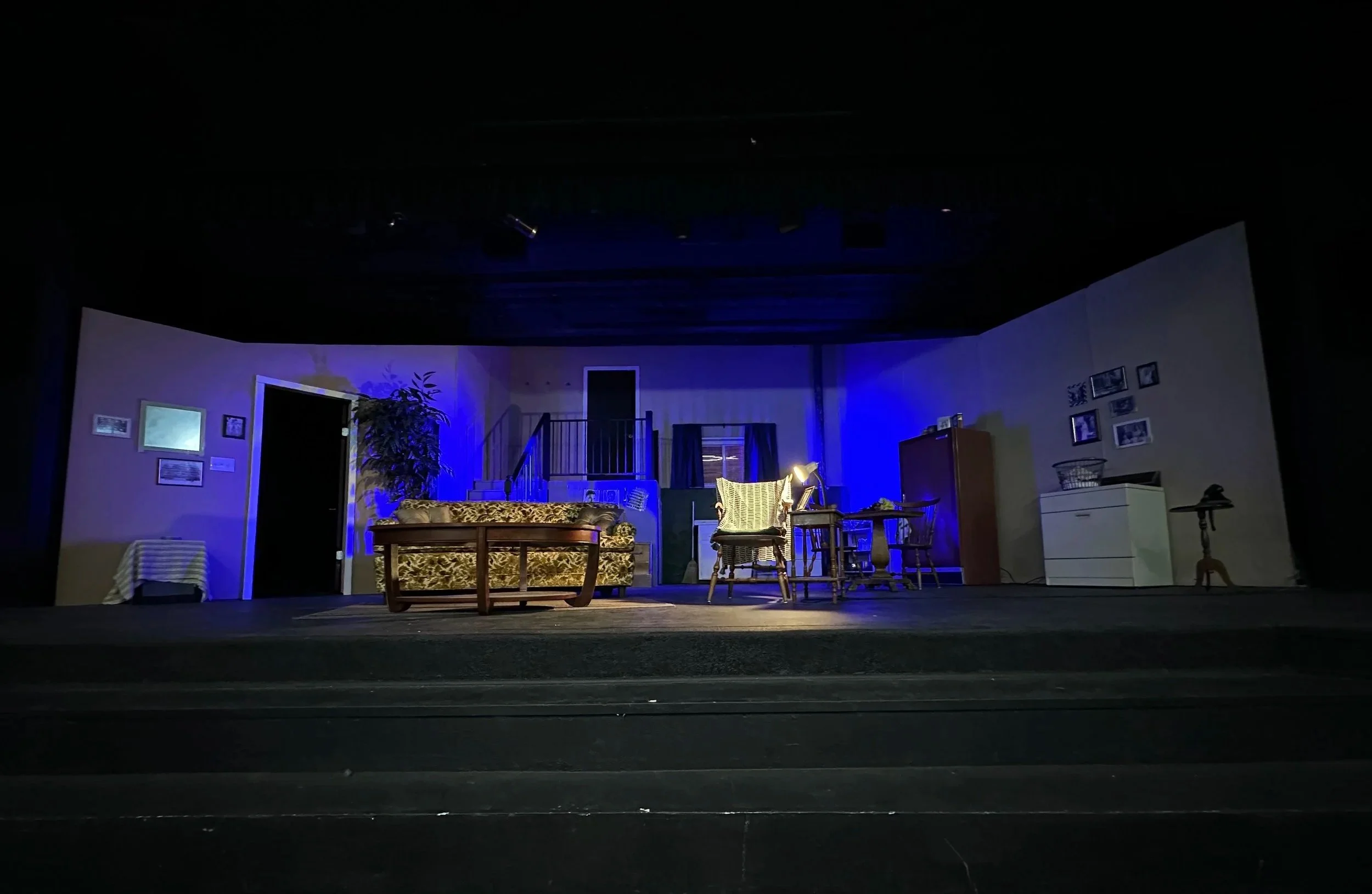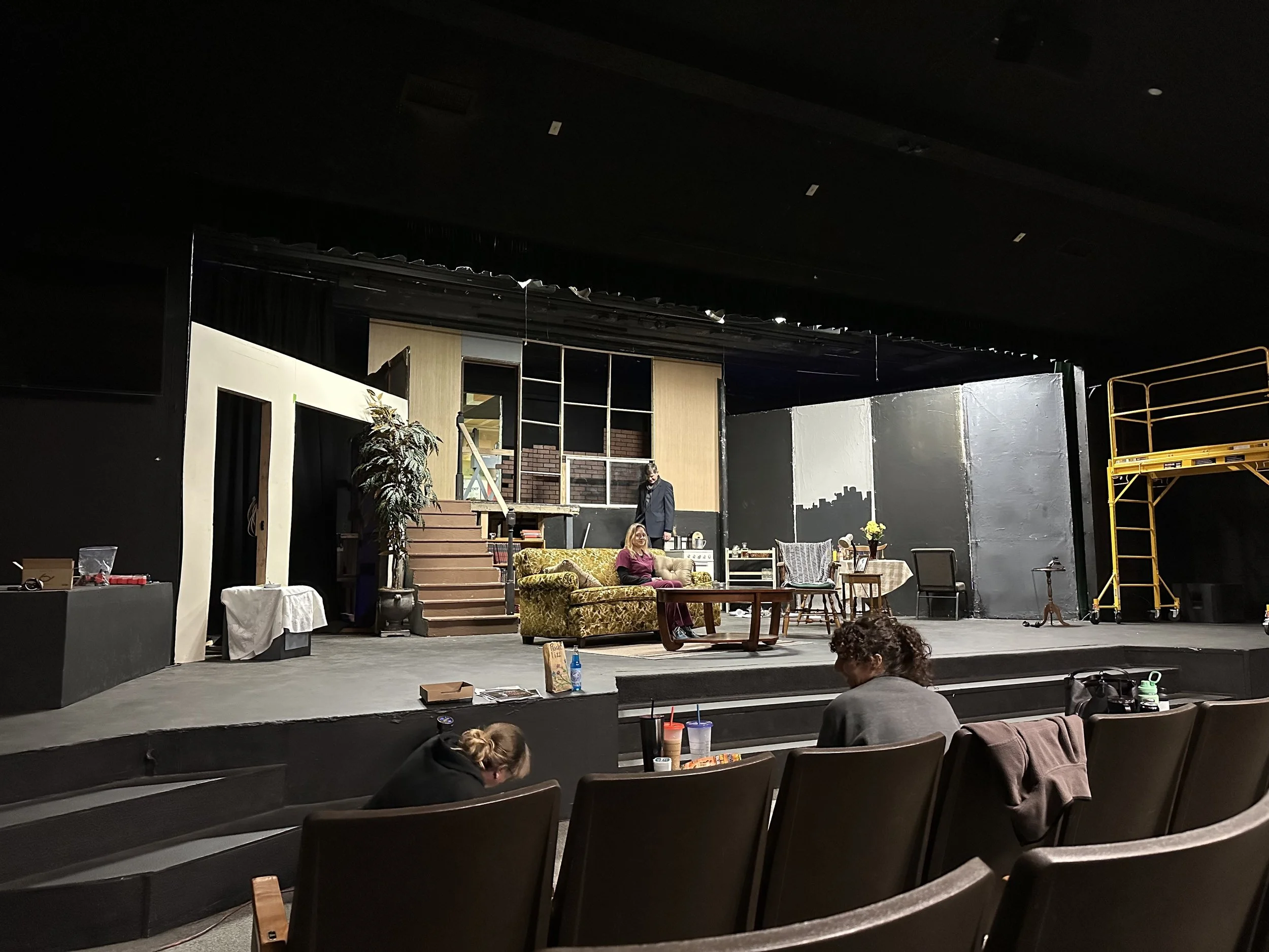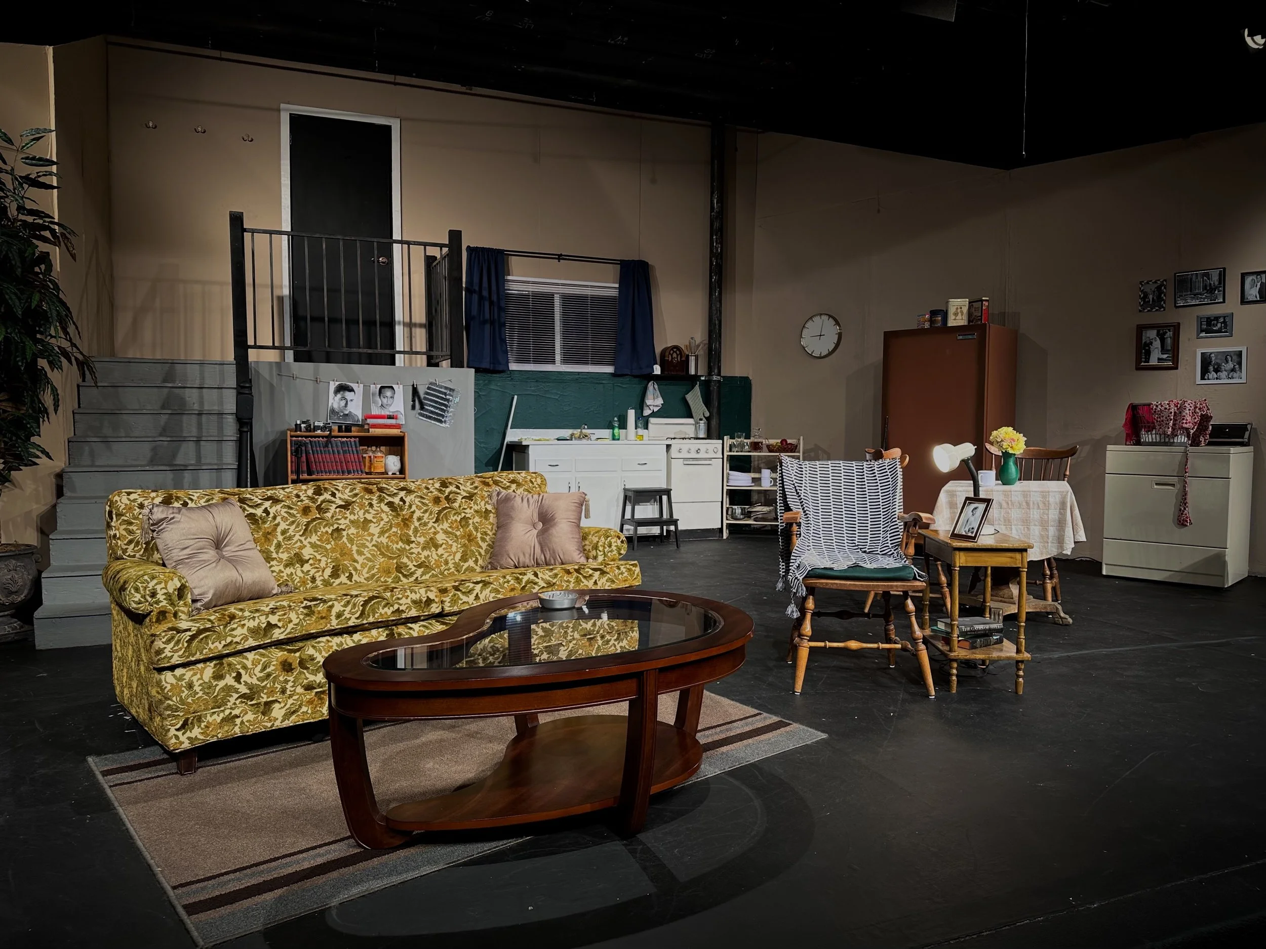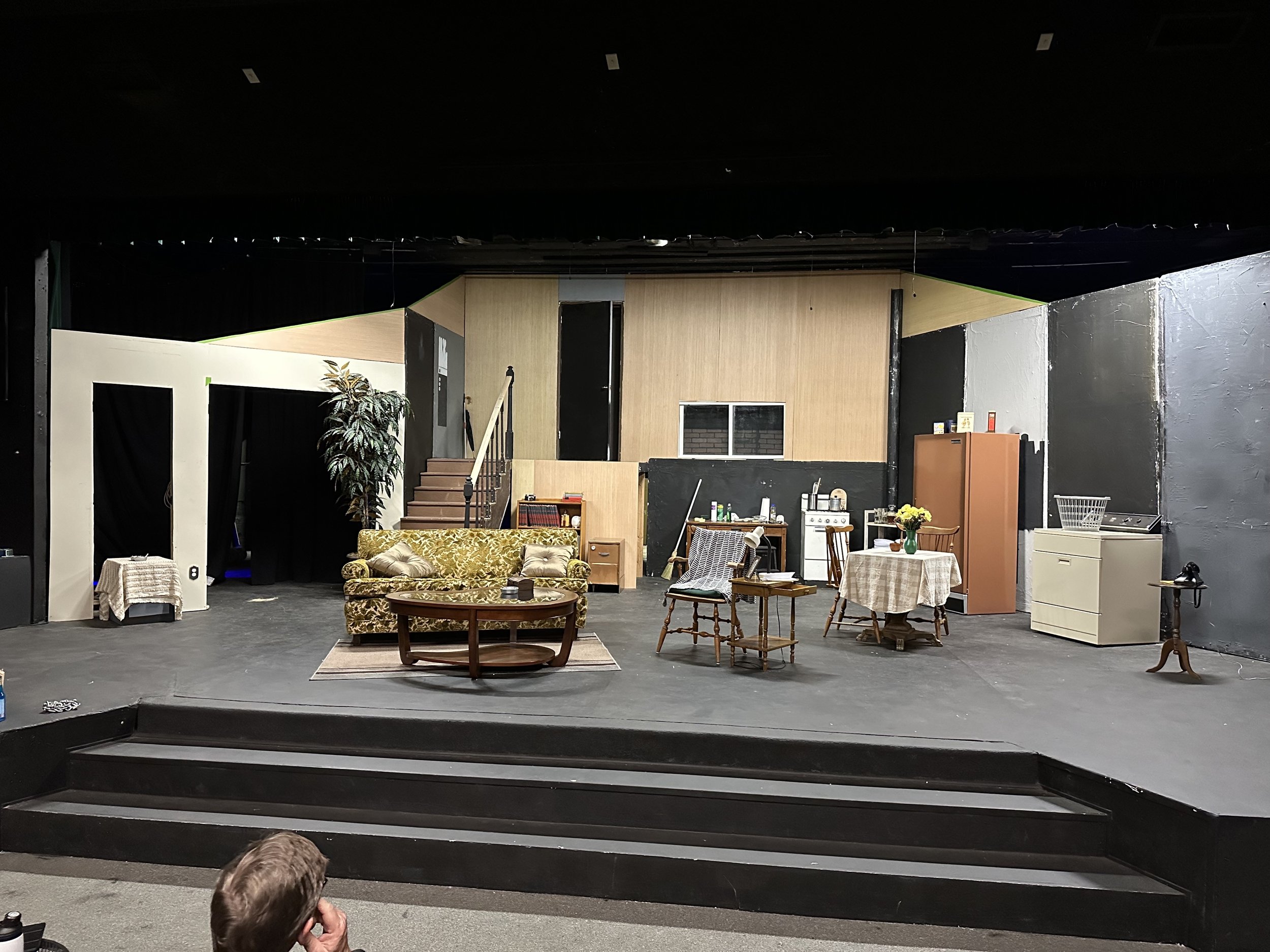 The central challenge was scale. The story takes place in a basement apartment, yet the action required a visible street level above the space, with characters appearing outside windows at eye level and entering from a door located above the apartment. This meant designing and building a split level apartment that read clearly as subterranean while fitting beneath a ceiling only twelve and a half feet above the stage.