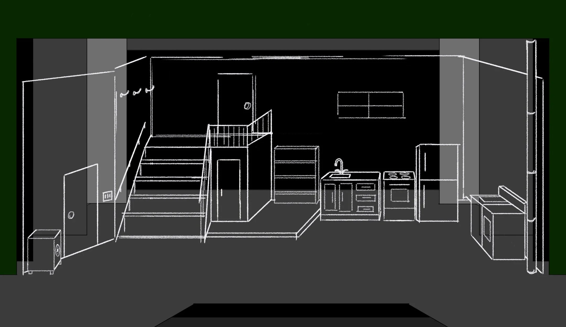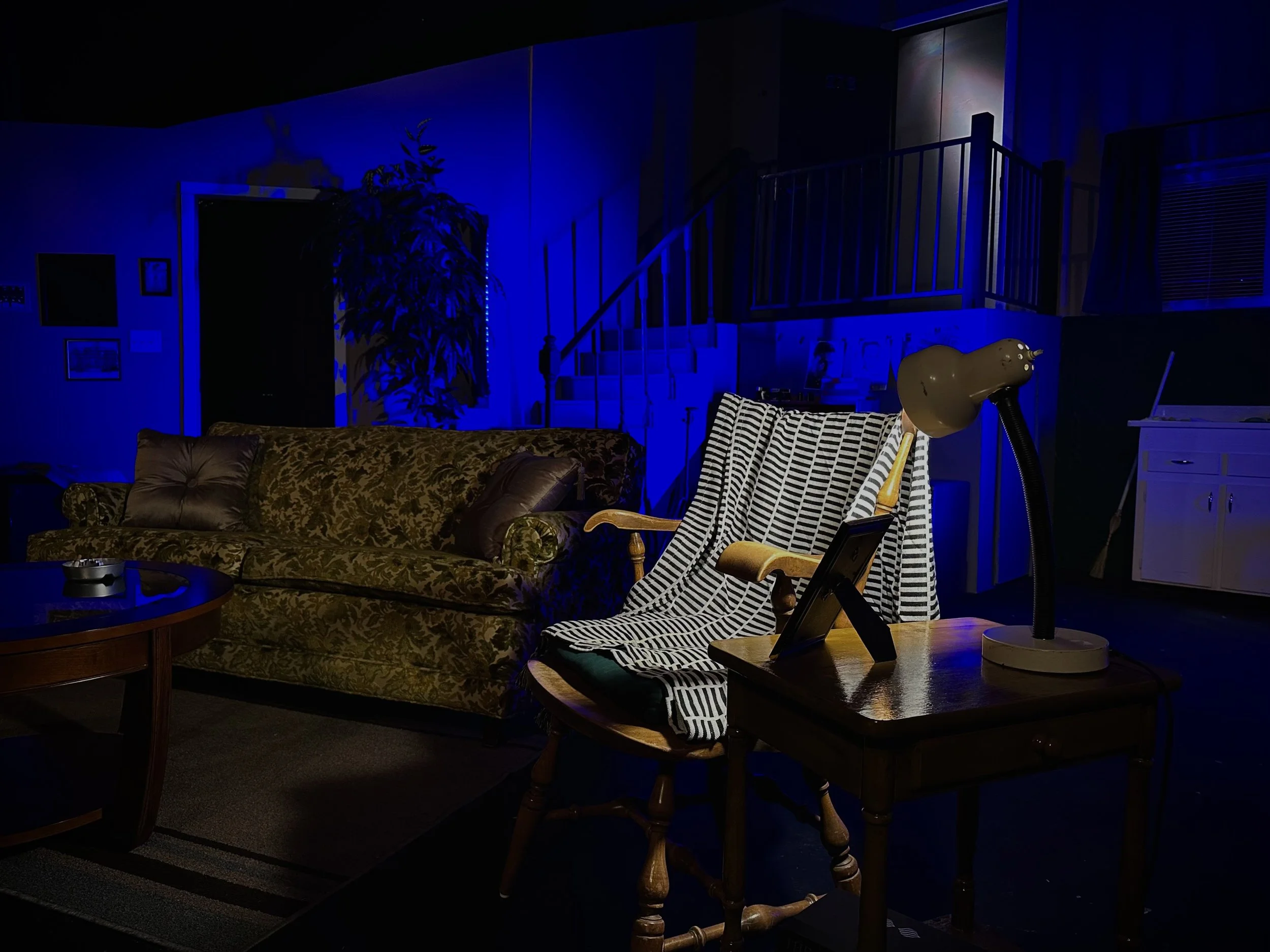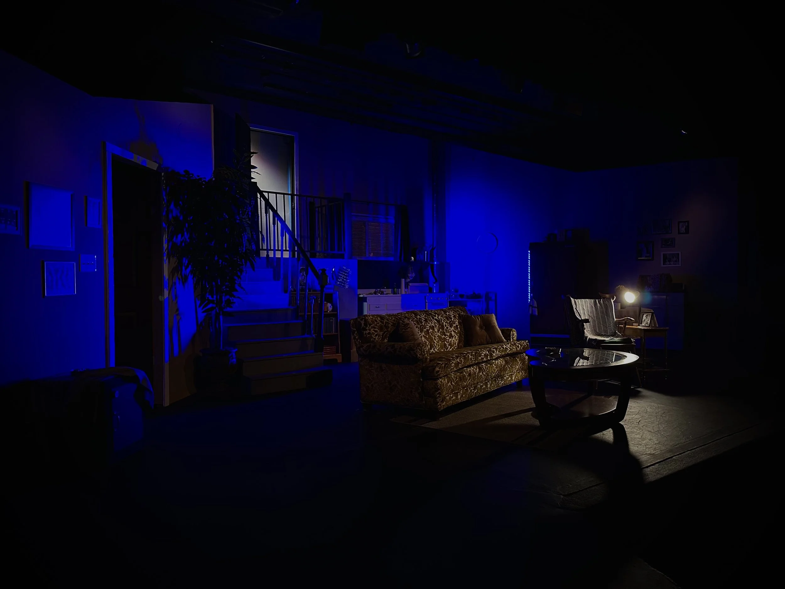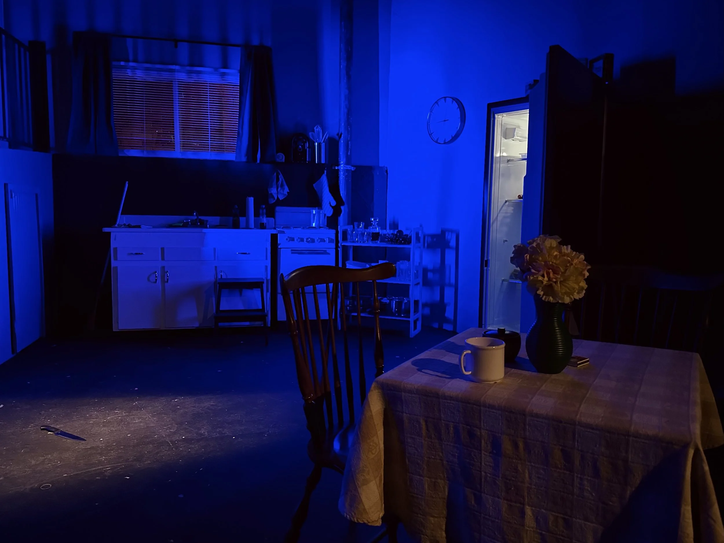 Special attention was given to safety and usability in darkness. Much of the second act takes place in near total blackout, requiring careful coordination between scenic layout, lighting design, and actor movement. Textures, angles, and clear pathways were deliberately designed to support spatial awareness without visible light. Practical elements such as the refrigerator, safe, and washer and dryer were integrated as required story devices and used as sources of motivated light during key moments.