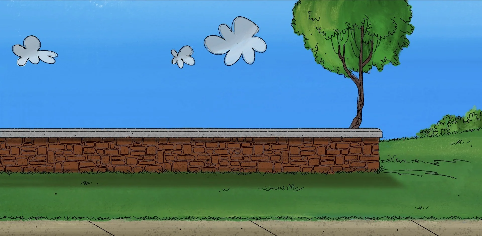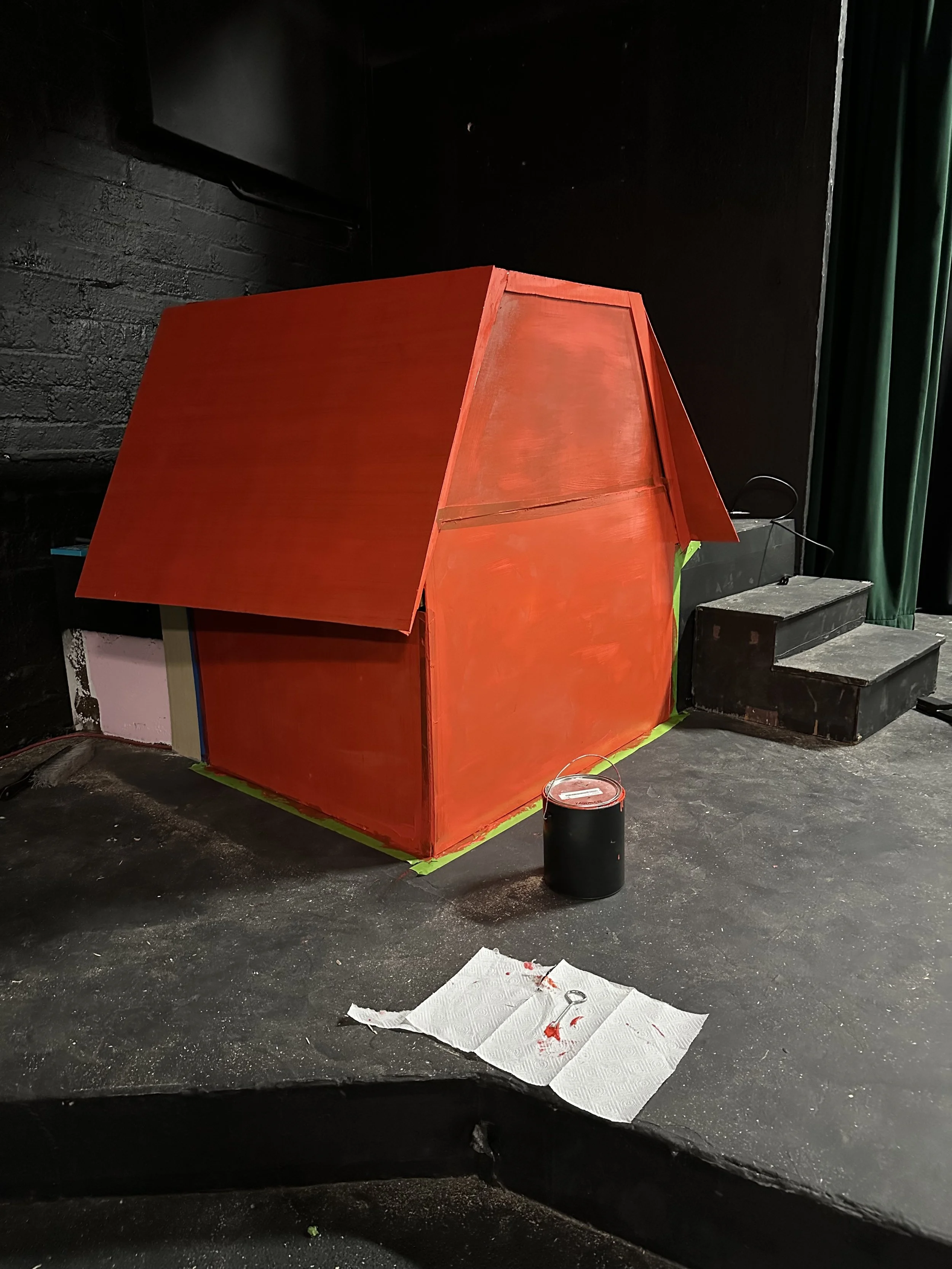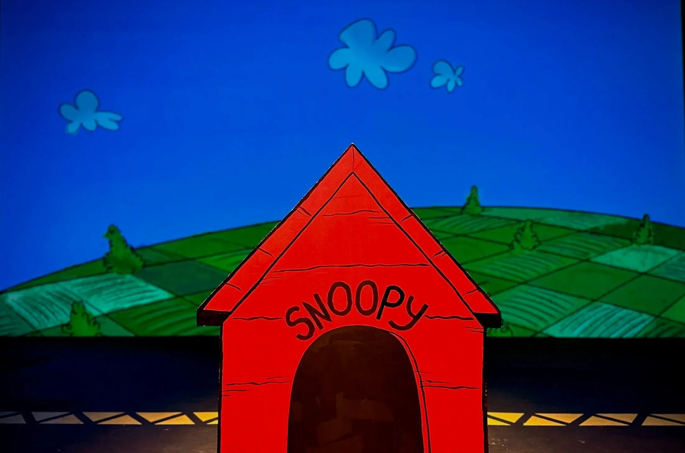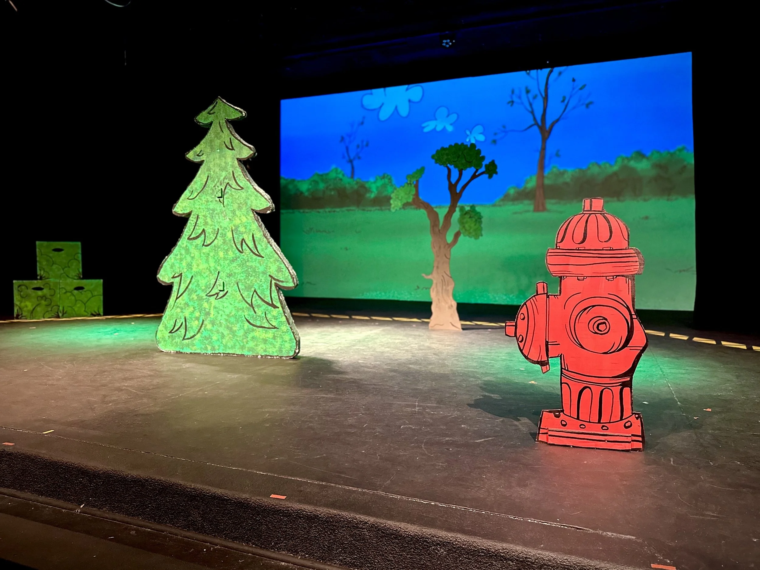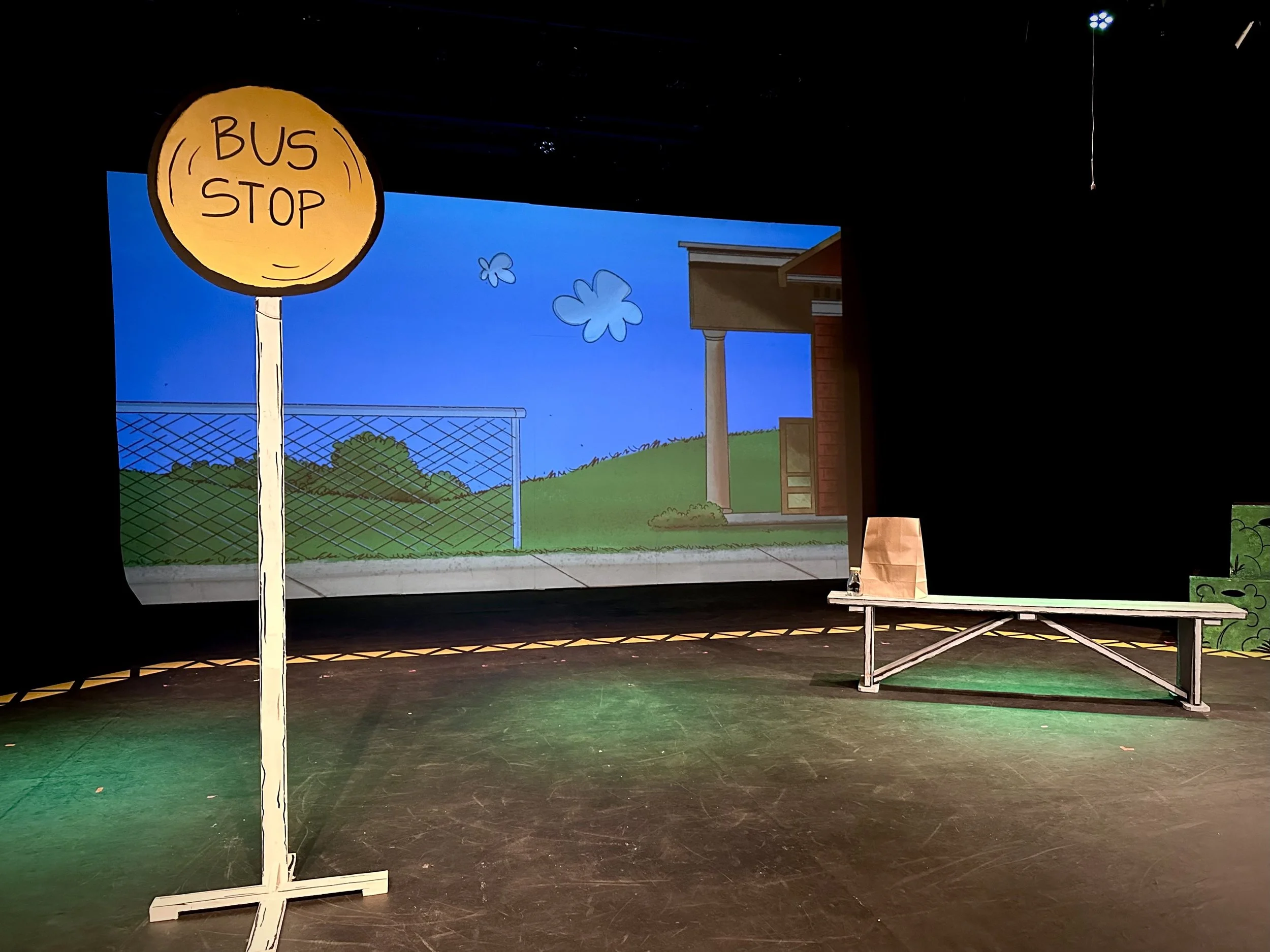 The set featured 2D scenic elements that matched the projected backdrops. Using luan panels, each piece was traced, cut, and painted to match the illustrations, effectively translating the comic strip into a three-dimensional stage space. Projections enhanced scenes but were not relied upon exclusively. Key moments included a scrolling street to simulate the school bus ride and Charlie Brown’s kite flying, both achieved with simple yet clever mechanical solutions and precise timing with the music. The illustrated, animated style of the set and backdrops reinforced the story’s charm and playful tone.
