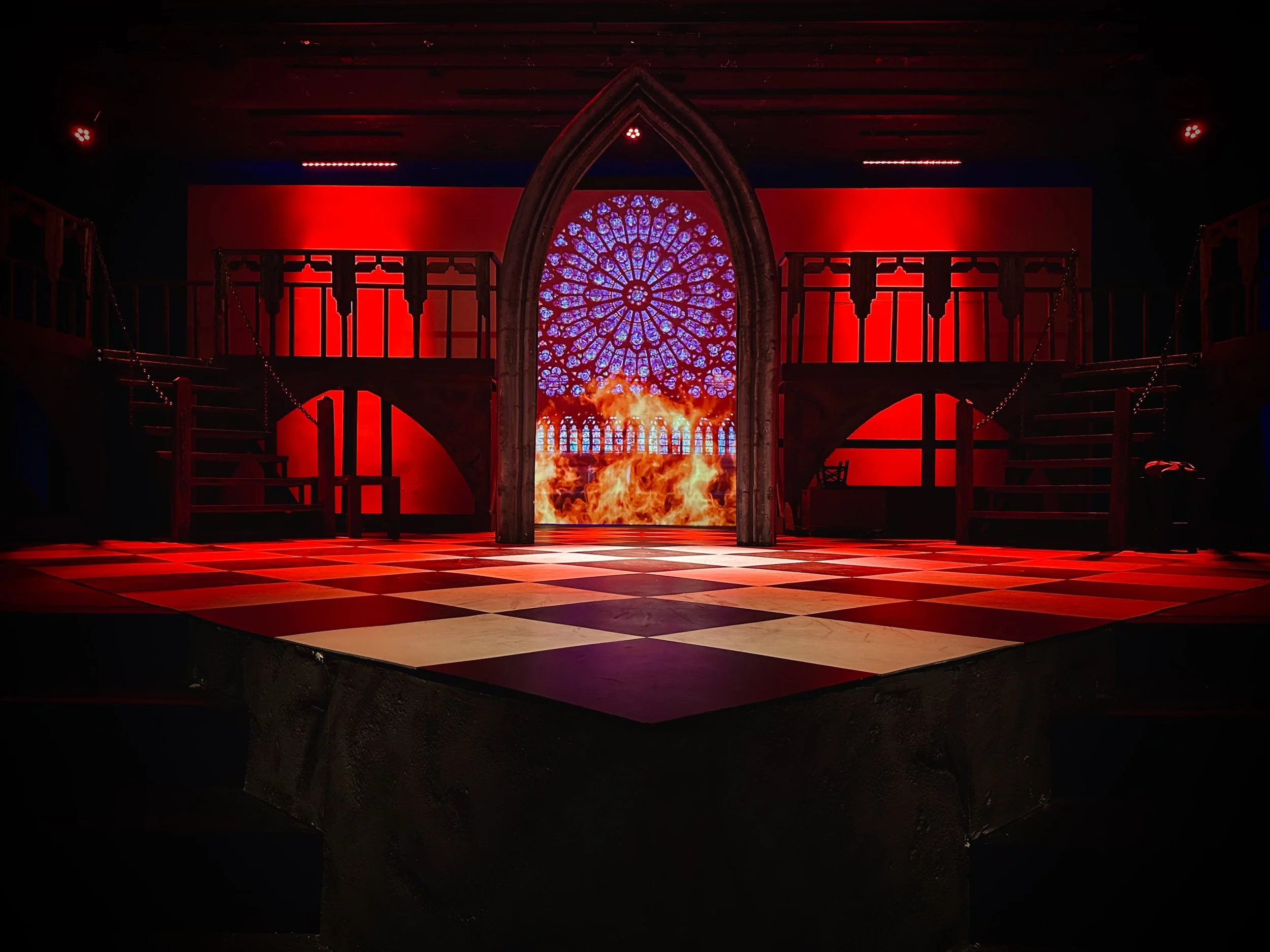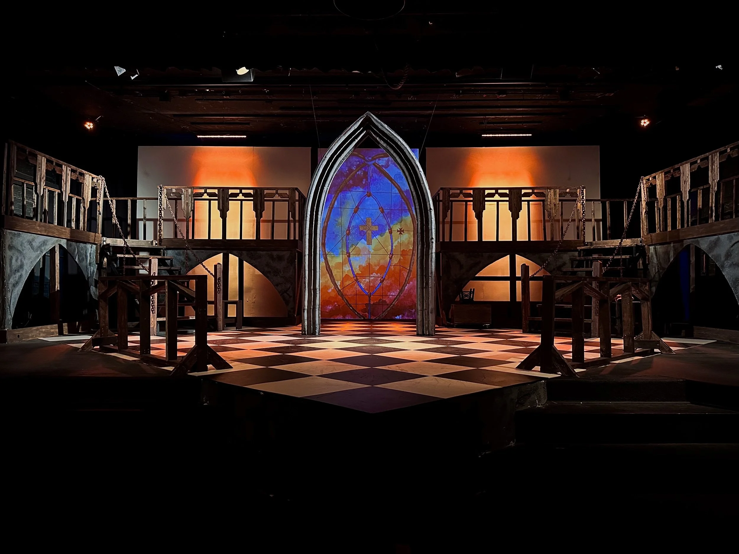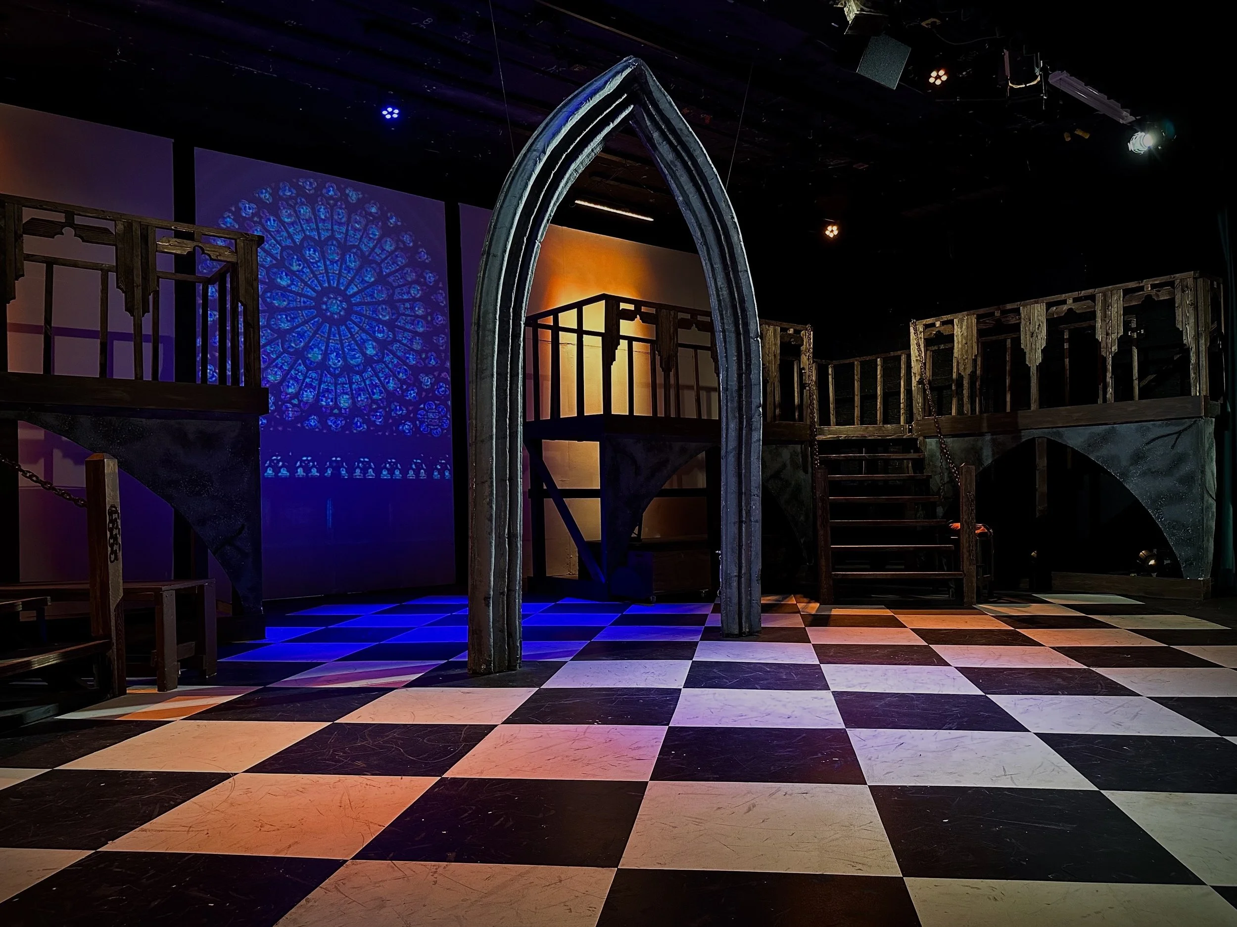 This production of The Hunchback of Notre Dame was designed as a large scale, immersive experience within a small community theater environment. Performed in a 125-seat venue with a strict budget of $4,000 and an entirely volunteer team, the goal was to achieve a sense of grandeur without overwhelming the audience or the performers.