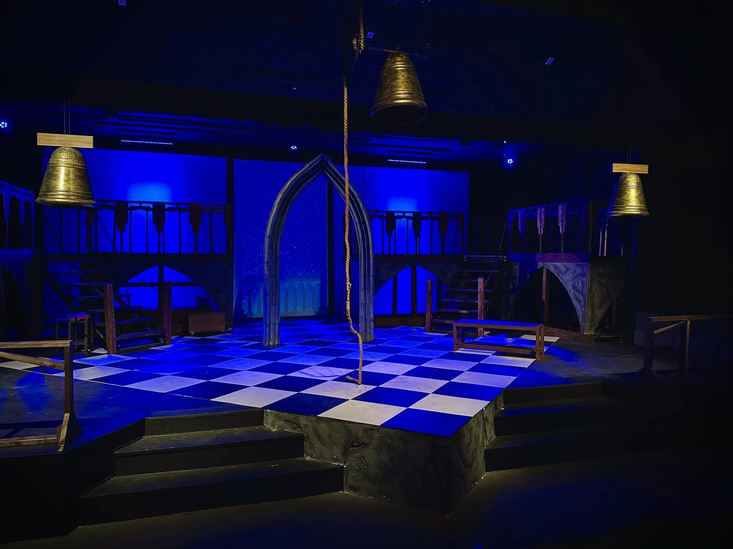 The scenic design was conceived as a multi-level unit set that could transform seamlessly between locations including the interior of the cathedral, the bell tower, the streets, and underground spaces. The physical structure included two levels, multiple platforms, four staircases, and functional bells that could be lowered into the playing space. One bell was practical, allowing a performer to pull the rope and swing the bell safely without producing sound.